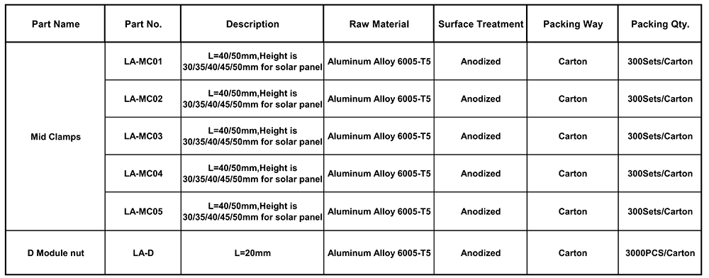 LARGE Solar Panel Mid Clamps are made of strength extrusion aluminum alloy 6005-T5 ,which can be used for solar panel installation with the thickness 25~50mm of solar modules.It is pre-assembled by different length of SUS304 screws and aluminum D module nuts to meet your solar panel's requirement.