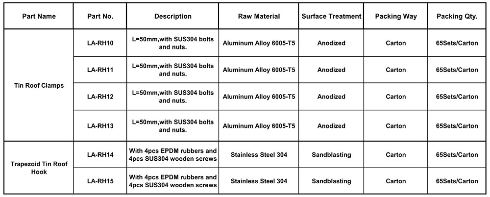 LARGE tin roof hooks are made of high quality aluminum alloy 6005-T5. and stainless steel 304.including the SUS304 hardware screws.